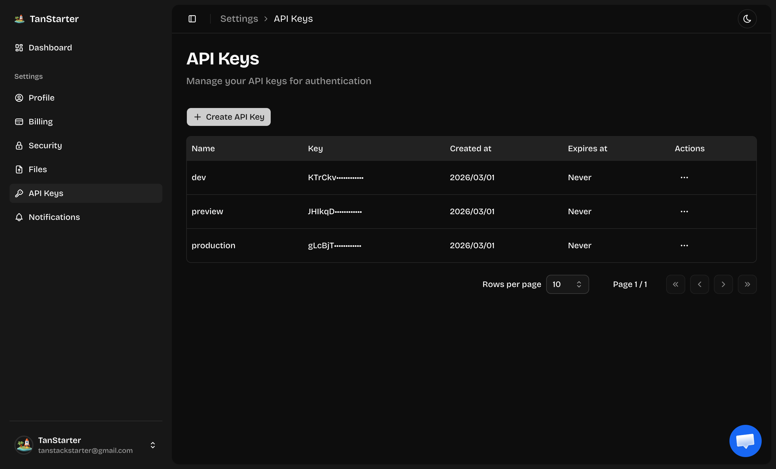 key_••••••••••••), created at, expires at (or "Never"), and a delete action per row. - Delete: Use the row menu to delete a key; it is invalidated immediately.